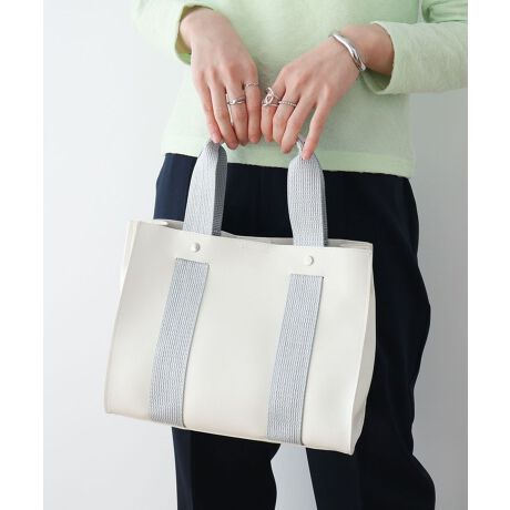 テープハンドルデザインがポイントのトートバッグ。ベーシックなスクエアフォルムはどんなコーディネートにも馴染みやすく、デイリー使いに最適です。コンパクトなフォルムながらマチを広めに設定することで収納力UP。きらりと輝くラメ入りテープのシンプルな3色と、パイソン柄フェイクレザーのアクセントカラーを含めた選べる4色展開です。※モデル着用画像は、光の当たり具合で色味が違って見える場合がございます。※お使いのモニター環境によって商品の色味が違って見える場合がございます。