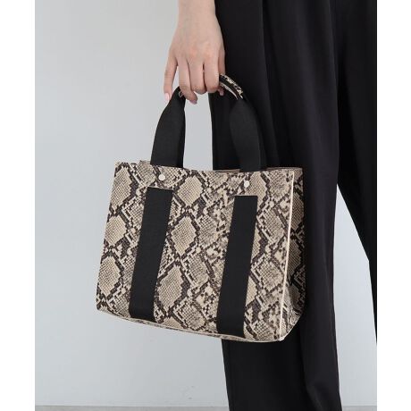 テープハンドルデザインがポイントのトートバッグ。ベーシックなスクエアフォルムはどんなコーディネートにも馴染みやすく、デイリー使いに最適です。コンパクトなフォルムながらマチを広めに設定することで収納力UP。きらりと輝くラメ入りテープのシンプルな3色と、パイソン柄フェイクレザーのアクセントカラーを含めた選べる4色展開です。※モデル着用画像は、光の当たり具合で色味が違って見える場合がございます。※お使いのモニター環境によって商品の色味が違って見える場合がございます。