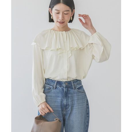 触れるとひんやり気持ち良い、接触冷感のレーヨン生地で仕立てたデザインブラウス。フリルをぐるりとあしらった襟がエレガントなデザインです。前後差のあるヘムラインでこなれ感あるスタイリングを後押し。幅広いボトムと相性良く、手軽にフレンチスタイルをお楽しみいただける1枚です。