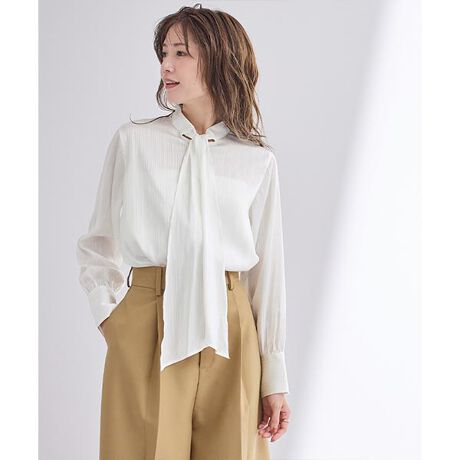 ◆DETAIL首元に沿ったハイネックのボウタイブラウス。後身頃にはギャザーを施し、ふんわりしたシルエットに。光沢のあるサテンストライプがジャケットのインナーとしても着映えする1枚に仕上げました。[型番:BFXU1737]