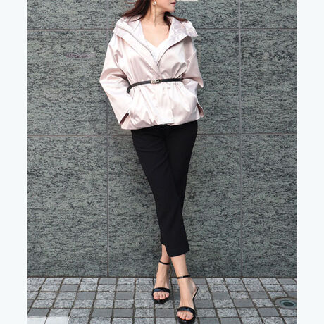 サテン素材のフェミニンムードなブルゾン。程よい光沢感のある生地が上品で洗練された大人な印象をもたらしてくれます。内側のウエスト位置にスピンドルコードを施しているので絞ってシルエットをシェイプさせることが可能。生地にハリがありアウターとしてとても使いやすく、休日カジュアルはもちろんタイトなワンピースや美脚パンツに合わせてデイリーのキレイめスタイルにシフトすることも自在。[型番:CFJR0189]