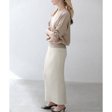 凹凸感のあるリブ編みニットで、身体のラインが出にくく安心感のある一枚です。