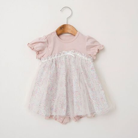 チュール使いドッキング半袖カバーオール