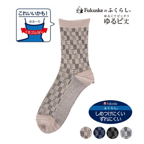 【FUKURASHI(ふくらし)】 靴下 ブロック柄 クルー丈 口ゴムなし(37786W)