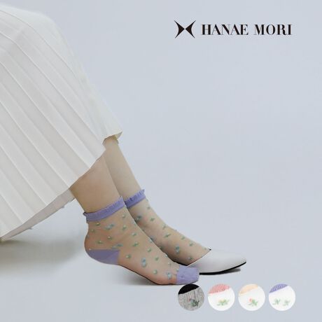 1945年創業、「エレガンス」を永遠のテーマとしているブランドHANAE MORI(ハナエ モリ)のシアーソックスです。クルー丈の透け感が魅力的なテグスソックスで、小花柄が華やかで可愛らしいデザインです。履き口はやわらかく、ゴムの跡がつきにくくなっています。パンプスと合わせてシックで上品に、スニーカーやサンダルと合わせて抜け感をプラスできる一足です。