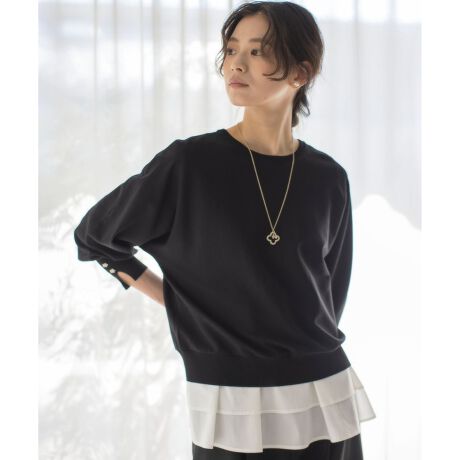 ■デザイン襟元のあきが女性らしいややボートネックのドルマンスリーブショートニット。ドルマンスリーブはどの肩でも似合う万能スリーブです。着丈はショートコンパクトでスカートにもボリュームのあるボトムにも相性抜群です。リブの後ろ部分にスリットを入れて後ろ姿も抜け目なく、袖口のリブ切り替えを幅広で斜めにすることで袖をスッキリみせてくれます。さらに袖カフスにスリットを入れメタルカラーとラインストーンの釦をアクセントに使用しています。1枚着ではもちろん、肌寒い時期はインナーにショールカラーブラウスやリヨセルシャーティングペプラムブラウスとレイヤードしてロングシーズン大活躍間違いなしのニットプルオーバーです。
