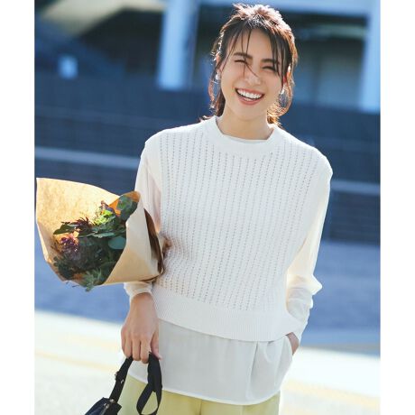 ・ラウンドネックのシンプルなニットベスト・ボクシーなシルエットで、レイヤードしやすい・アイレットが入っており目を惹くデザイン