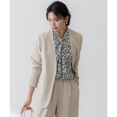 上品な印象のノーカラージャケット。インナーにTシャツを着ても、きれいめに見えるので同素材のテーパードパンツやワイドパンツに合わせて程よい抜け感のある新しいオフィススタイルにもお勧めです。ウエストを絞りすぎないラインと、ヒップにかかる丈のバランスが様々なボトムスと合わせやすいデザインになっています。袖口をロールアップして、こなれた着こなしも叶います。また、裏地がなくシワになりにくいので、出張の際の持ち運びにも対応しやすく、着脱後の手持ちの際などにも気軽にお取り扱いいただけます。カラーは、柔らかく肌なじみの良いベージュ(#033)、ニュアンスカラーのモスグリーン(#053)、シックでお仕事にもオススメのネイビー(#075) 、様々なシーンに対応できるブラック(#005)の4色展開です。