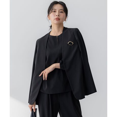 上品な印象のノーカラージャケット。インナーにTシャツを着ても、きれいめに見えるので同素材のテーパードパンツやワイドパンツに合わせて程よい抜け感のある新しいオフィススタイルにもお勧めです。ウエストを絞りすぎないラインと、ヒップにかかる丈のバランスが様々なボトムスと合わせやすいデザインになっています。袖口をロールアップして、こなれた着こなしも叶います。また、裏地がなくシワになりにくいので、出張の際の持ち運びにも対応しやすく、着脱後の手持ちの際などにも気軽にお取り扱いいただけます。カラーは、柔らかく肌なじみの良いベージュ(#033)、ニュアンスカラーのモスグリーン(#053)、シックでお仕事にもオススメのネイビー(#075) 、様々なシーンに対応できるブラック(#005)の4色展開です。