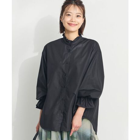 ・スタンドカラーの襟端と袖口のフリルがポイントのブラウス。