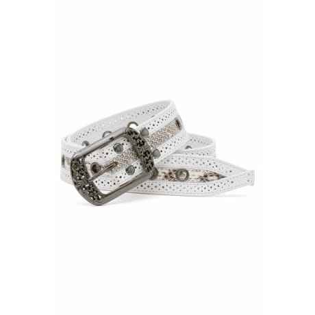 ヘビ革をパンチングを施したレザーで挟み込み、全体にハトメをあしらったフリーサイズ仕様のベルトに仕上げています。