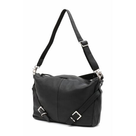 オイルシュリンクレザーをふんだんに使い、ベルトアクセントと金具類でモードな印象に仕上げています。