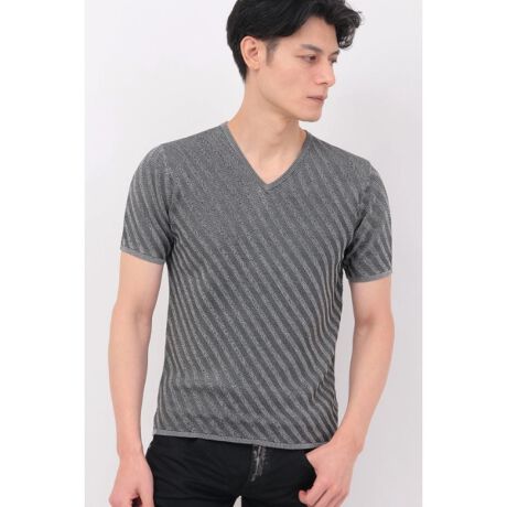 組織感のあるバイアスのストライプ柄が、シャープな印象に見せてくれるVネックの半袖袖ニットです。