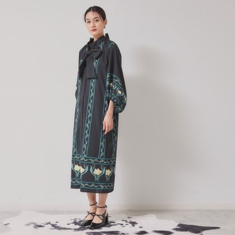 パネルプリントの柄行を生かしたストレートシルエットのワンピース。