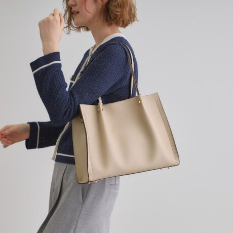 フロントのタックハンドルデザインがおしゃれなスクエアフォルムトートバッグ。