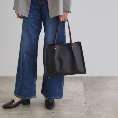 フロントのタックハンドルデザインがおしゃれなスクエアフォルムトートバッグ。