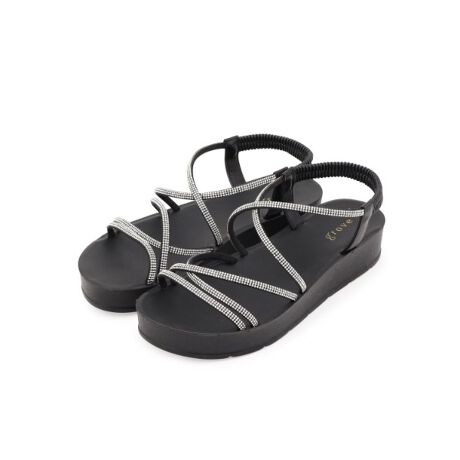 スタイルアップが期待できる厚底タイプのサンダルに、細かいラインストーンをあしらったストラップを使用したサンダル。