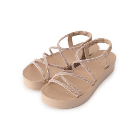 スタイルアップが期待できる厚底タイプのサンダルに、細かいラインストーンをあしらったストラップを使用したサンダル。