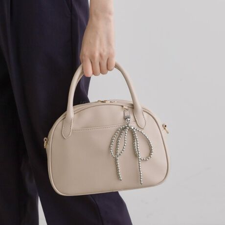 丸みのあるフォルムがかわいいボストンバッグに、リボンモチーフのチャームがセットになっています。