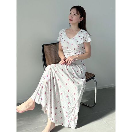 SNIDEL HOME定番のカシュクールワンピースを、春らしいギンガムチェックとチェリー柄でキャッチーに仕上げました。