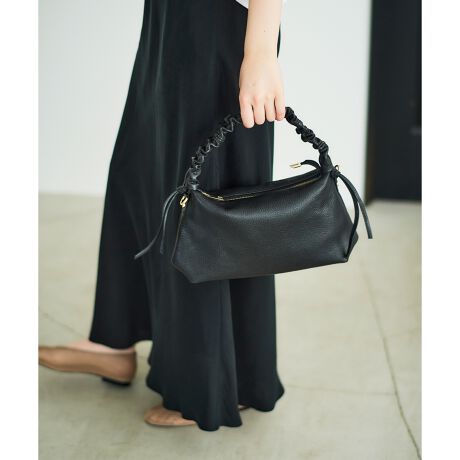 ギャザーを寄せたハンドルが特徴的で、上質なレザーの風合いを引き立てます。カジュアルにもきれいめスタイルにもマッチする、万能なデザインが魅力です◎