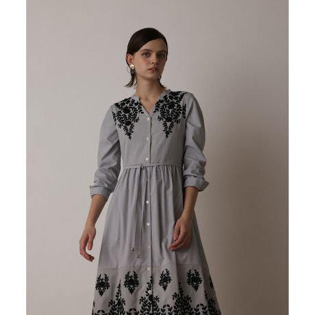 一枚で着映える、前開きタイプのカフタンワンピース。今季注目の先染めストライプ合繊生地に、前身頃と裾に立体感のある刺繍を丁寧に施した、華やかで美しい表情の一枚です。 体に張りつかず開放感のあるゆったりとしたシルエットながら、すっきりとしたVネックにウエストリボンを添えた事で自然とメリハリの効いたシルエットを表現しました。カフタンならではのリラクシーな雰囲気はそのままに、ほっこりし過ぎないグレースコンチネンタルらしい大人な一枚。シーズンムードを引き立てるこの春の主力になる事間違いなしのワンピースです。