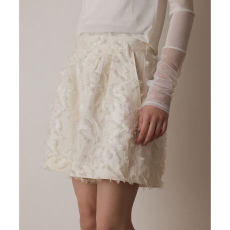 ふわっとした可憐なシルエットが魅力的な、春の気分を纏うジャガードパンツ。 しなやかな風合いのカットジャガード素材を使用した、高級感溢れる一枚。長めのフリンジが生み出す表情の豊かさとシーズンらしいナチュラルなカラーが相まって、春らしい優雅なスタイリングを楽しめます。ツータックを入れふわっとしたシルエットを表現した事で体のラインを拾わず、大人の女性もトライしやすい上品な一本に仕上げました。お揃いジレとの新鮮なセットアップスタイルもおすすめです。