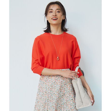 天竺編みで仕上げた、7分袖のクルーネックドルマンプルオーバー。前後差を少し付け、襟もとを少し後ろに抜いて着用すると、より女性らしくやわらかな印象になるよう仕上げています。袖口にきかせたスリット開きもポイント。ゆったり感のある身頃で体型カバーが叶い、あらゆるボトムと好相性なので幅広く活躍する一枚です。カラーは、抜け感のあるカーキ(#054)、華やかなレッド(#010)、明るい印象のイエロー(#040)、上品なネイビー(#075)、爽やかなライトグリーン(#062)の5色展開です。