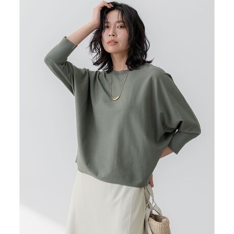 天竺編みで仕上げた、7分袖のクルーネックドルマンプルオーバー。前後差を少し付け、襟もとを少し後ろに抜いて着用すると、より女性らしくやわらかな印象になるよう仕上げています。袖口にきかせたスリット開きもポイント。ゆったり感のある身頃で体型カバーが叶い、あらゆるボトムと好相性なので幅広く活躍する一枚です。カラーは、抜け感のあるカーキ(#054)、華やかなレッド(#010)、明るい印象のイエロー(#040)、上品なネイビー(#075)、爽やかなライトグリーン(#062)の5色展開です。