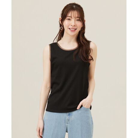 ・ニュアンスカラーにラメが入ったトレンド感のあるテレコタンクトップ・ベーシックなタンクトップに繊細なラメを施す事で華やかにアップデート・襟ぐりと袖ぐりにチュールを施す事で今年らしい印象に・ギラギラしすぎない品のあるラメの質感がヘルシーな印象