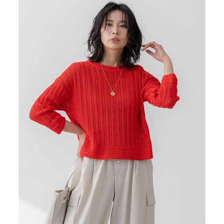ランダムなストライプ風の透かし柄ニットプルオーバー。ヘルシーな肌見せが叶う、カジュアルなサマーニットです。スタイリングにほど良い抜け感と軽やかさをトッピングします。少しハリのある素材感がオフボディーのゆとりをたもち、暖かい時季でも肌に張り付かず、着心地も良いです。ショートめのレングスバランスがボトムを選ばずに合わせやすいのもうれしいポイント。ハイウエストのワイドパンツとの組み合わせもおすすめです。カラーは、目を引くレッド(#010)、爽やかなホワイト(#001)、シックなブラック(#005)、ナチュラルな雰囲気のブラウン(#030)の4色展開です。