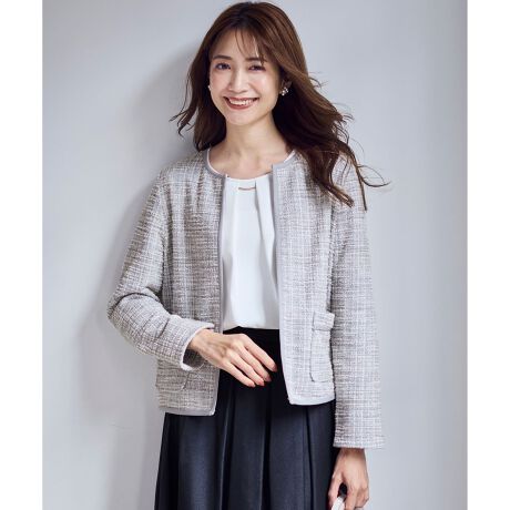 ・ジャケット ... 上品に着こなせるツイード風のカットジャカード素材。ジャージーなので程よい伸縮性がございます。ご家庭でのケアも楽ちん。さり気ないラメで上品さを引き立て、華やかな一着に仕上がっています。・ブラウス ... 透けにくいやや厚地のジョーゼット素材。適度にドライ感があり柔らかく、春や秋にぴったりの素材です。