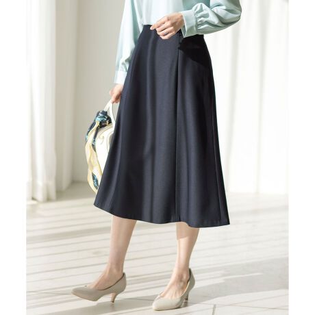 ・自然にスタイルアップして見えるハイウエストデザイン・さりげないメタルパーツの艶感が女性らしいポイントに・ジャケットにも合わせやすい美しく自然なフレアシルエット・きちんと感のあるひざ下丈