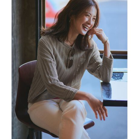 ランダムなストライプ風の透かし柄ニットプルオーバー。ヘルシーな肌見せが叶う、カジュアルなサマーニットです。スタイリングにほど良い抜け感と軽やかさをトッピングします。少しハリのある素材感がオフボディーのゆとりをたもち、暖かい時季でも肌に張り付かず、着心地も良いです。ショートめのレングスバランスがボトムを選ばずに合わせやすいのもうれしいポイント。ハイウエストのワイドパンツとの組み合わせもおすすめです。カラーは、目を引くレッド(#010)、爽やかなホワイト(#001)、シックなブラック(#005)、ナチュラルな雰囲気のブラウン(#030)の4色展開です。