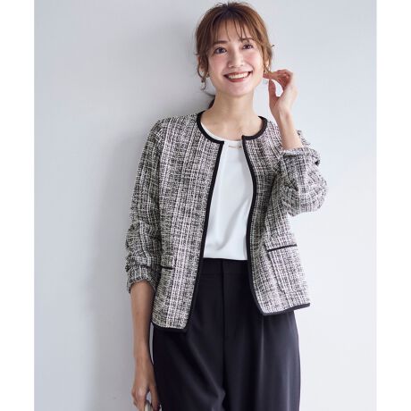 ウォッシャブルなジャケットとシンプルなブラウスのセットです。・ジャケット ... 細部にトリミングを施した上品な印象の一着。ツイード見えするジャージー素材のため着心地も快適です。裏地なしで軽く羽織ることができます。ホックは首元のみにすることで少し抜け感のあるデザインに。袖口はスリット入りで折り返し可能です。・ブラウス ... 1枚でも華やか見えするメタルバー付のブラウスです。メタルバーは取り外し可能。それぞれお手持ちのアイテムと着回しもでき、パンツにもスカートにもマッチするスタイリングのしやすい優秀セットです。