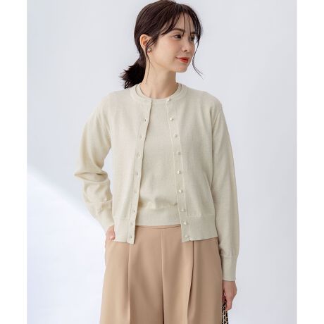 ■デザインクルーネックの長袖ベーシックカーディガン×5分袖ニットがセットになったアンサンブルニット。多めに付けたサテンのクルミ釦が上品な印象です。インナーのニットは首元を美しく見せてくれる詰まったクルーネックで、ふんわりとした5分袖が腕を華奢にみせてくれます。つかず離れずのフィット感で、体のラインを拾いすぎないよう計算されたデザインもポイント。シンプルなデザインのカーディガンとプルオーバーは単品でも活躍間違いなし。春、夏、秋と3シーズン使える素材感で、いつものスタイリングをブラッシュアップしてくれます。