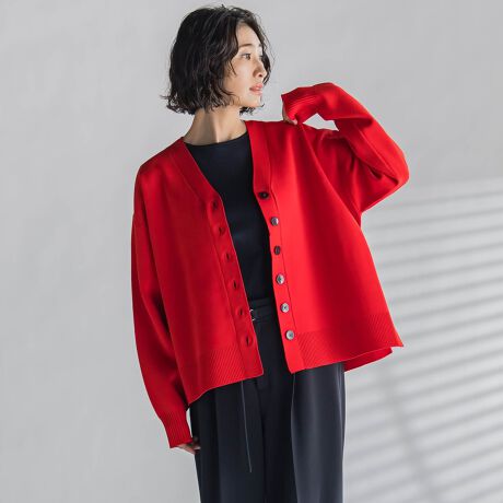 フォルムが出る地厚の編地で仕立てながらも、糸自体の嵩高性と軽量感で着心地も兼ね備えた一枚。