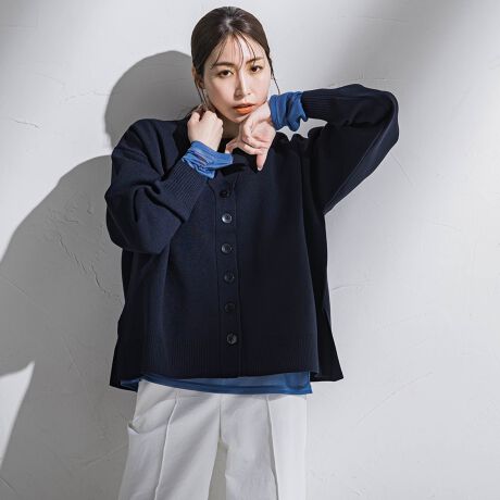 フォルムが出る地厚の編地で仕立てながらも、糸自体の嵩高性と軽量感で着心地も兼ね備えた一枚。
