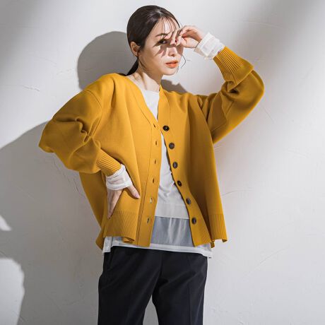 フォルムが出る地厚の編地で仕立てながらも、糸自体の嵩高性と軽量感で着心地も兼ね備えた一枚。