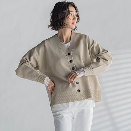フォルムが出る地厚の編地で仕立てながらも、糸自体の嵩高性と軽量感で着心地も兼ね備えた一枚。