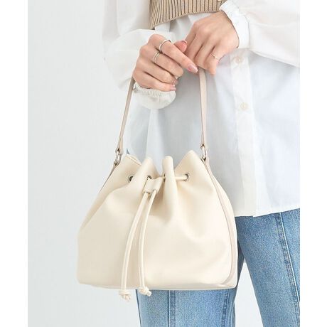 ソフトで滑らかなフェイクレザーで仕立てたデザインバッグ。ドロストコードで巾着型に絞りを入れたコンパクトなフォルムが特徴です。華奢なハンドルに繋がるバイカラー配色がさり気ないポイント。きれいめはもちろん、カジュアルなスタイリングにもマッチするおすすめのアイテムです。※モデル着用画像は、光の当たり具合で色味が違って見える場合がございます。※お使いのモニター環境によって商品の色味が違って見える場合がございます。