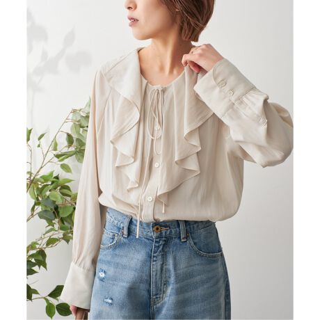 ナチュラルさもありながら華やかな印象を与えてくれるラッフルフリルブラウス。