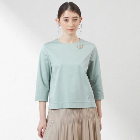 ボーダーと無地の2色展開で、カジュアルにもキレイ目にも着られる商品です。裾にアマカのMの文字が光沢のある刺繍糸で刺繍されており、ポイントになっています。また、衿ぐりや袖口はスレキの見返しがついた布帛仕立てになっており