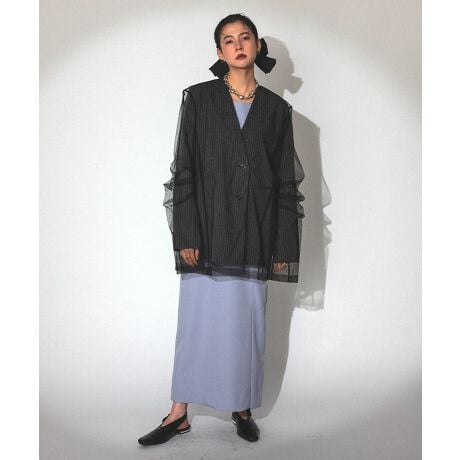 ポリエステル×レーヨンのピンストライプ素材とハリ感のあるチュール素材をレイヤードした、ボクシーなカラーレスジャケットです。