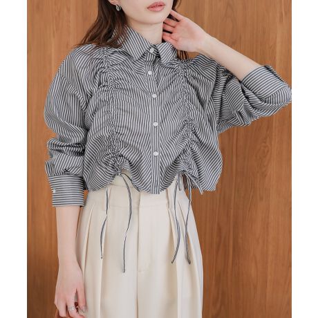 裾のリボンを絞れば、スリットのようなシルエットが完成するデザインシャツです。シャーリングデザインが程よくフィットしたシルエットに。袖口はつまり過ぎず、程よいワイドシルエットで抜け感がでてカジュアルにまとまります◎清涼感のあるストライプがコーディネイトのアクセントにぴったりです。