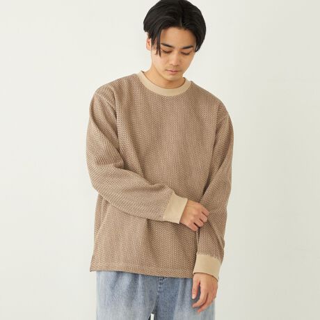 凹凸感のある素材を採用し、身頃の裾はリブを使わずに仕上げることでロンTのような着心地に。