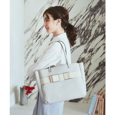 【A4サイズ対応】レザー調の素材にオペラリボンをあしらった大人可愛い3ルームトートバッグ。
