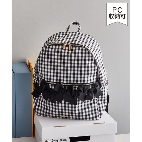 \13インチまでのPC収納可能/ギンガムチェックの生地にランダムにあしらったリボンが大人可愛いリュック。