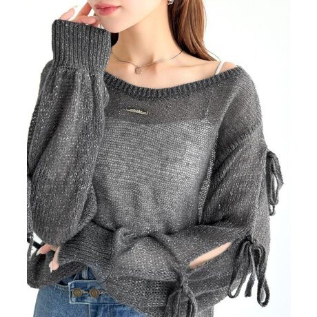 【mily bilet】プレートデザイン透かし編み袖リボンラメニット(ワンオフショル2way)