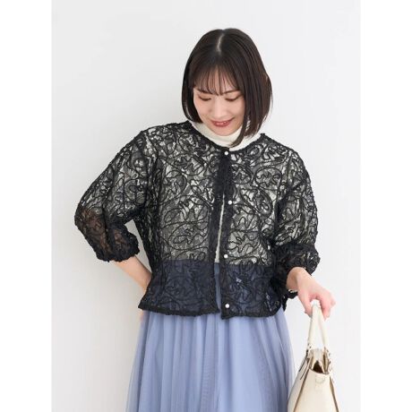 ・繊細なレース刺しゅう素材で仕立てられた羽織るだけで大人のフェミニンコーデが即完成するアイテム。